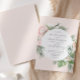 This elegant wedding invitation features a white circle surrounded by a watercolor illustration of lush pink flowers and green tropical foliage on a blush pink background. Customise the charcoal grey text with your wedding details. The reverse side is a coordinating shade of solid blush.