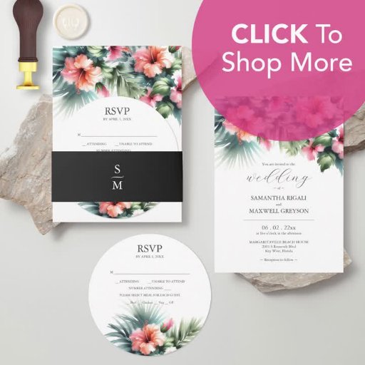 Invite your guests to celebrate your special day with our floral wedding invitations! Each piece is adorned with elegant watercolor hibiscus flowers with palm leaves bursting with pink and orange. Customise with your personalised text. These invitations offer a perfect glimpse of the charm and sophistication of your tropical destination wedding.