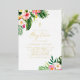 Invite guests to your event with this customisable gold foil baptism invitation. It features water topical flowers and leaves with a matching tropical pattern. Personalise this watercolor baptism invitation by adding your own event details. This tropical baptism invitation is perfect for summer baptisms.