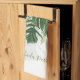 This personalised contemporary summer themed kitchen towel is modern and stylish, with a clean minimal design featuring watercolor tropical leaves and trendy handwriting script.