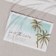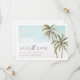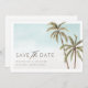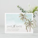 Modern tropical beach theme save the date cards, perfect to announce your tropical beach theme wedding date. Blue sky and sandy gradient background with our watercolor tropical palm trees. "Save the date" is beautifully designed in san serif and script typography. Customise with your names, date, and location. Artwork hand-painted by Moodthology Papery