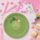 Colorful paper plates featuring a round, spring greenframe bordered by watercolor hibiscus blooms and palm leaves. The repeating, palm leaf background pattern is optional and can be deleted if preferred. Script text of 'Love and Thanks' is also optional. Add your names and wedding date using the provided template. This tropical design is perfect for summer, beach and tropical weddings, birthdays and other special events. Search ID577 to see matching products.