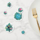 Colourful confetti featuring a round teal frame for the bride and groom's initials and wedding date bordered by palm leaves. Additional pieces have a bold toucan and watercolor hibiscus blooms. The white background is optional and can be changed if preferred. This confetti is perfect for summer, beach and tropical weddings, birthdays and other events. Search ID577 to see matching products.