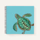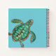 A fun notebook decorated with a green turtle drawn with black ink and painted with watercolor on a ocean blue background. You can customise the background colour to fit your needs.
