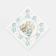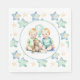 Cute blue and green watercolor baby shower paper napkins for twin boys with starry background. Cute watercolor twin boys with a blue balloon and teddy bear and cute bluish green stars in the background.