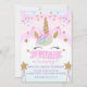 Looking for a mostly pink unicorn invitation for your little girl birthday party? This designs features a unicorn face, some stars, wands, clouds and hearts on a rainbow shaped pink coloured background. The back of the invitation is mostly pink with a hint of purple and blue. More unicorn themed birthday invitation designs are available at the store. This girls pink unicorn birthday invitation is ready to be personalised.