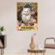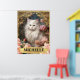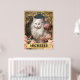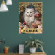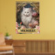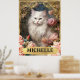 Gorgeous Watercolor Vintage White Cat and Pink Roses floral design with gold leaves frame