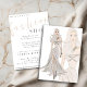 A hand painted watercolor blonde fashion model wearing a flowing beige gown on a stylish charity benefit fashion show invitation