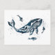 a decorative watercolor painting of a whale and some smaller fish in blue colours on a postcard