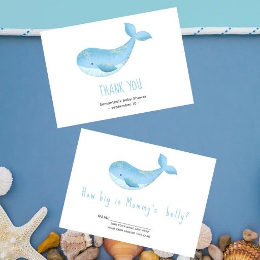 A little one on the way with this under the sea themed baby shower invitation, featuring baby whale in soft blue watercolors.