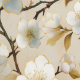 Watercolor white floral Japanese cherry blossoms outlined in gold on solid cream background.