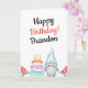 A whimsical watercolor design featuring a cheerful gnome holding a birthday cake, surrounded by charming mushrooms, a playful and festive way to celebrate.