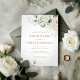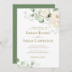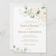 A soft and elegant wedding invitation featuring watercolor white roses and delicate greenery —