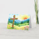 This customizable easter card features a colorful watercolor style portrait of a cross covered in wildflowers in a scenic mountain valley.