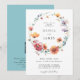 This design features a delicate watercolor wreath made of wildflowers in shades of blue, red, orange, violet, and gold. Perfect for spring and summer outdoor weddings.