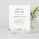 Celebrate the bride-to-be with this stunning Watercolor Wildflowers Bridal Brunch Invitation! The elegant white background is beautifully adorned with an elegant boho font that adds a touch of whimsy to the design. The stunning colourful wildflower meadow at the bottom of the invitation creates a beautiful contrast to the simple, yet chic, top portion. This invitation is perfect for any bride who loves bohemian style and wants to celebrate her upcoming nuptials with a fun and festive bridal brunch. Send this invitation to all the important women in the bride's life and get ready for a memorable celebration!