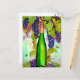 Postcard features watercolor green wine bottle with purple grape clusters, grape vines and little butterflies. Digital wine art image created with AI software