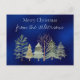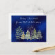 This simple and elegant, yet festive Christmas holiday postcard features a cosy watercolor design. An image of a winter forest is placed across the bottom, with various trees sprinkled with snow. A sample family name and Christmas greeting are printed at the top. You can personalise the postcard to include your own custom name or text. The background on the front features a dark blue textured pattern, to resemble a winter night.