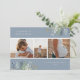 Pretty watercolor winter greenery arrangements, three photo holiday card. Card features, winter greenery in soft shades of blue and green with dusty blue colour backgrounds. Template provides two spaces for your custom text and three photos.