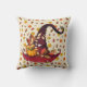 Charming seasonal throw pillow features a watercolor dark red witch's hat with pumpkin and fall foliage, on an Autumn leaves background