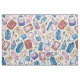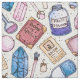 Fabric with watercolor bottles, vials, herbs, books of alchemy and spells, candles, magic wands and crystals on the starry beige background.