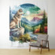 This is a tapestry that has a watercolor rendering of a wolf in nature.