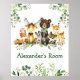 Watercolor Woodland Animals Room Poster Print. Baby Animals include Bear with Green Bow, Deer, Moose, Racoon, Bunny Rabbit, Fox and Owl on eucalyptus leaves and forest greenery. Add Name.