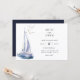 Watercolor yacht, nautical theme wedding invitation. Coordinating dark navy blue colour backing. Invitation features chic typography design style mix of calligraphy and bold type.