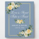 Modern Elegant Watercolor Yellow White Floral Dusty Blue Love Is Sweet, Take A Treat Wedding Favour Table Sign Plaque includes yellow roses, white flowers and botanical greenery on a gold frame.