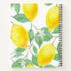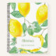 A college ruled notebook for school work, taking notes and writing stories. Juicy, delicious watercolored lemons in yellow, green and white. A label on front with templates for Your name and the book title. Green letters. The name is written with a modern hand lettered style script. For students, teen girls and women.