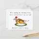 A cute watercolour funny dachshund dog merry christmas postcard. On a white background, the typography text reads After sampling the christmas Turkey, Hector confirmed that it was just right, followed by Merry Christmas. An adorable Dachshund dog is seen inside the turkey whilst wearing a red Christmas Santa hat.