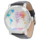 Political world map featuring watercolour filled countries on an off-white aged background. The map includes country names, borders and sea names.