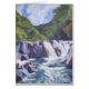 Acrylic painting of a waterfall with water tumbling over the rocks below; trees in background set against a blue sky with white clouds. Blank card for your own message.