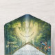 Imagery of waterfalls, natural portals, a tropical forest, and fantasies for wall art featuring a gold diamond frame or an open zipper layer decorated with tropical birds for personalised invitation cards, available in print or as a download.