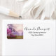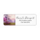 Address labels with a scenic image of a peaceful purple lake. Surrounded by lush cherry trees and waterfalls.