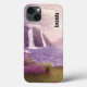 A phone case with a scenic image of a peaceful purple lake. Surrounded by lush cherry trees and waterfalls.