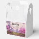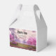 A tiny favour box with a scenic image of a peaceful purple lake. Surrounded by lush cherry trees and waterfalls.
