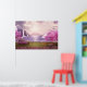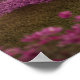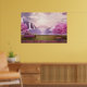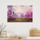 Poster with a scenic image of a peaceful purple lake. Surrounded by lush cherry trees and waterfalls.