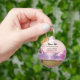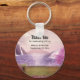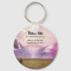 A wedding favour key chain with a scenic image of a peaceful purple lake. Surrounded by lush cherry trees and waterfalls.