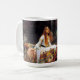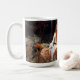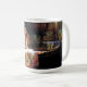 John William Waterhouse The Lady of Shalott mug. Oil painting on canvas from 1888. The Lady of Shalott is a beautiful Pre-Raphaelite painting of a scene from Alfred Lord Tennyson’s poem of the same name. The painting depicts the doomed Lady of Shalott sailing towards Camelot in a small boat draped with a beautiful red tapestry she wove while falling in love with Lancelot. In the boat sit three candles and a crucifix from which the girl looks away. The lady herself is clothed in a flowing light blue mediaeval dress embroidered with gold. Her hair is light auburn and she holds the chain of the boat as it presses away from the dock into the reeds and lily pads beyond. A great gift for fans of John William Waterhouse, the Pre-Raphaelites, Romantic English painting, and Arthurian Legend.