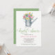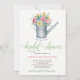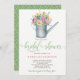 Vintage watering can with spring and summer multicolor flowers bouquet making an elegant rustic pastel watercolor floral bridal shower invitation. The card has a white background on the front side and a geometric pattern on sage green (editable colour) background on the reverse. It features a fancy calligraphy script and modern contemporary text lettering.-------- Ideal for an outdoor, garden spring or summer elegant country chic shower party.