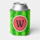 This pretty watermelon monogram foam can cooler design has a round fruit that looks like it's been sliced, so the juicy pink-red flesh of the melon shows through, along with a circle of black watermelon seeds. The berry also has a speckled green, mottled rind pattern background.