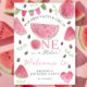 Kawaii and Cute watermelon Pink Girl 1st Birthday Party Invitation. Design features watercolor watermelons, watermelon-themed holiday flags, watermelon heart, watermelon seeds, "one in a melon!" and a watercolor smiling watermelon slice. Our sweet little girl is one in a melon!