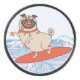 Wave riding happy pug dog on surfboard hockey puck