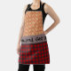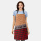 This apron has a mid-century modern design of orange wavy lines on a gold background, red circles on a brown background, and a grey background. If you want the same design with different colours, message me.