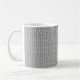 This mug has an Art Deco design of black curved lines in a triangle shape on a field of white repeated across the design.