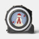 This wintery tape measure features a waving snowman in a red hat and red mittens standing in falling snow.