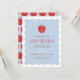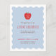 Created to coordinate with the "Wavy Apple" preschool graduation announcement collection, this modern, charming graduation invitation features a sweet, halftone apple illustration with a "Class of (Year)" message overlay. Beneath the illustration is the message "the apple of our eye", followed by the name of your child and their school, as well as the graduation party details. The text and design is placed over a solid blue background, with a playful, white wavy frame border. The back of the card features a coordinating halftone apple pattern.