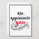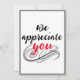 A casual "we appreciate you" card. Red and black appreciation script with scroll and grey border card that you can make personal with a nice gesture from the boss, co-worker or staff on the inside. Just use the "personalise this template feature' to edit the text to make it your own. Other paper styles available.