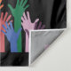 Social justice themed design features multi-colour "We are all human" text and hands representing the LGBTQ community